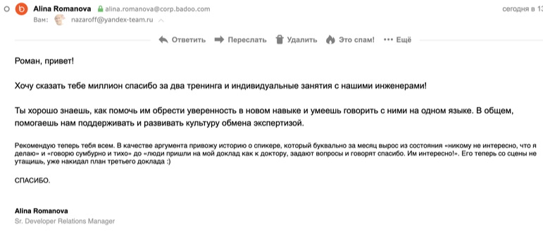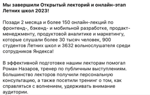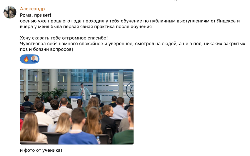 В 2018 году "публичные выступления" являлись самой посещаемой и популярной программой внутреннего обучения "Яндекса". Объединяет в своем тренинге два самых важных навыка: навык продаж и навык публичных выступлений.